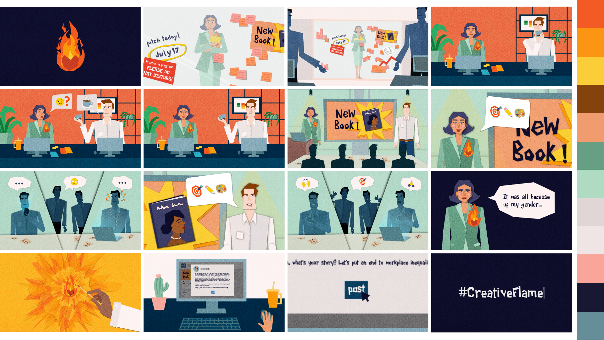 We embraced the character introduced in the initial style frame, leading to the development of Sarah Smith, our main character. Crafted in a paper cut aesthetic, Sarah embodies strength, confidence, and independence, resonating with those who have faced challenges in male-dominated industries.
