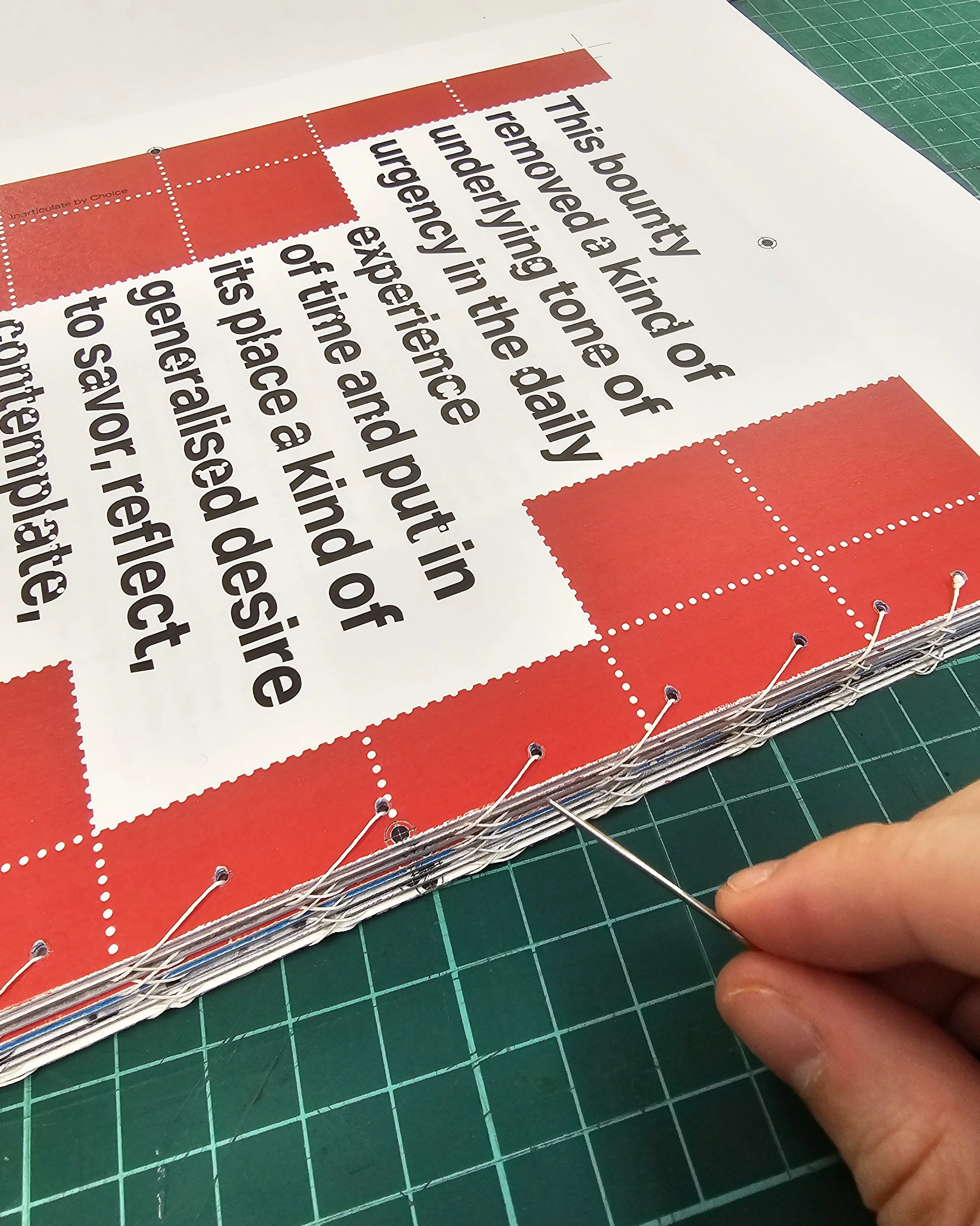 With the concept established, I moved into prototyping, producing both large-scale and 3×4 cm mockups. I experimented with screenprinting, letterpress and hand binding to understand how material and process could communicate the evolution of written communication. The final books were drumleaf bound — 800 pages cut and glued by hand — and the accompanying publication was finished with a whip stitch bind.