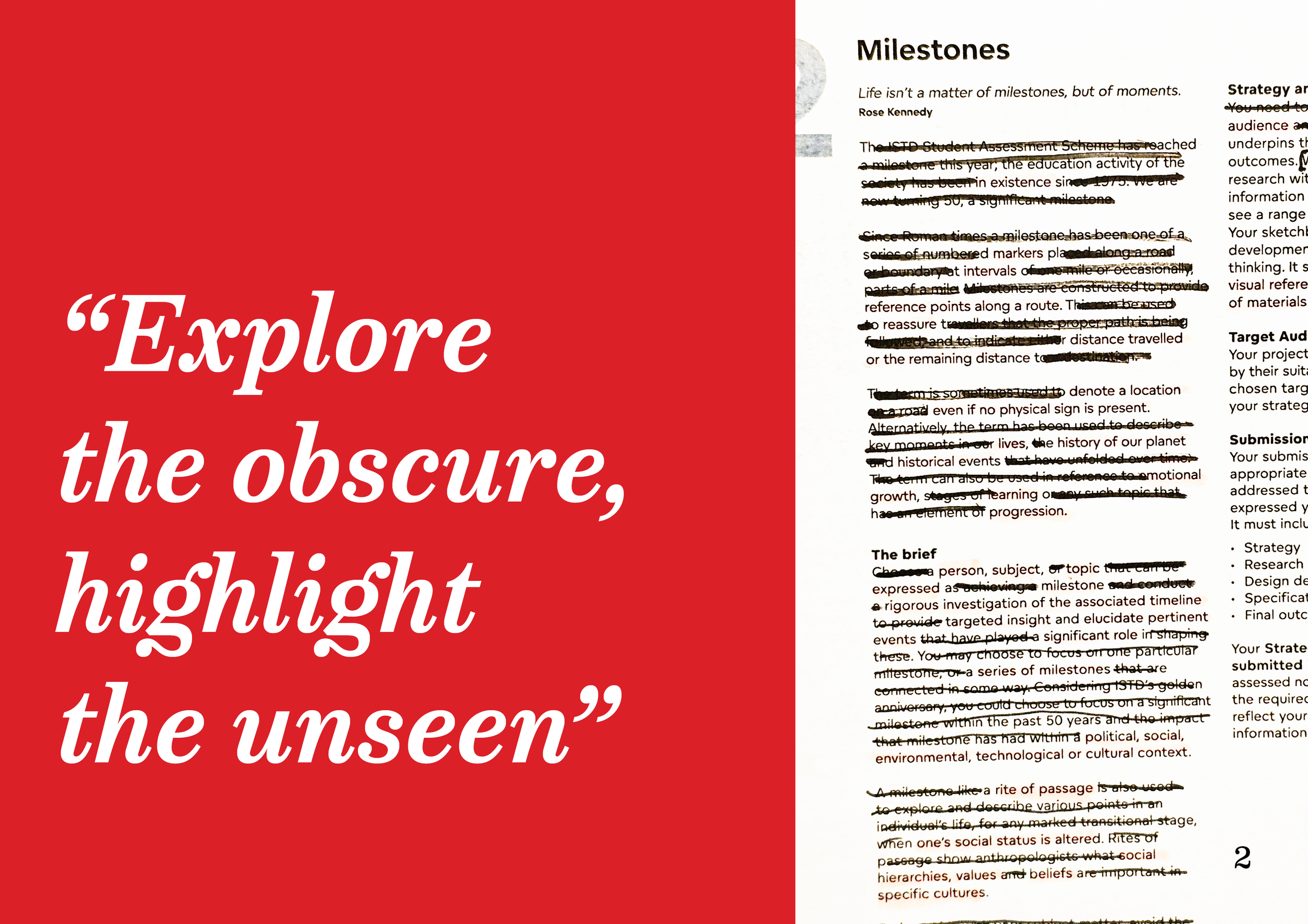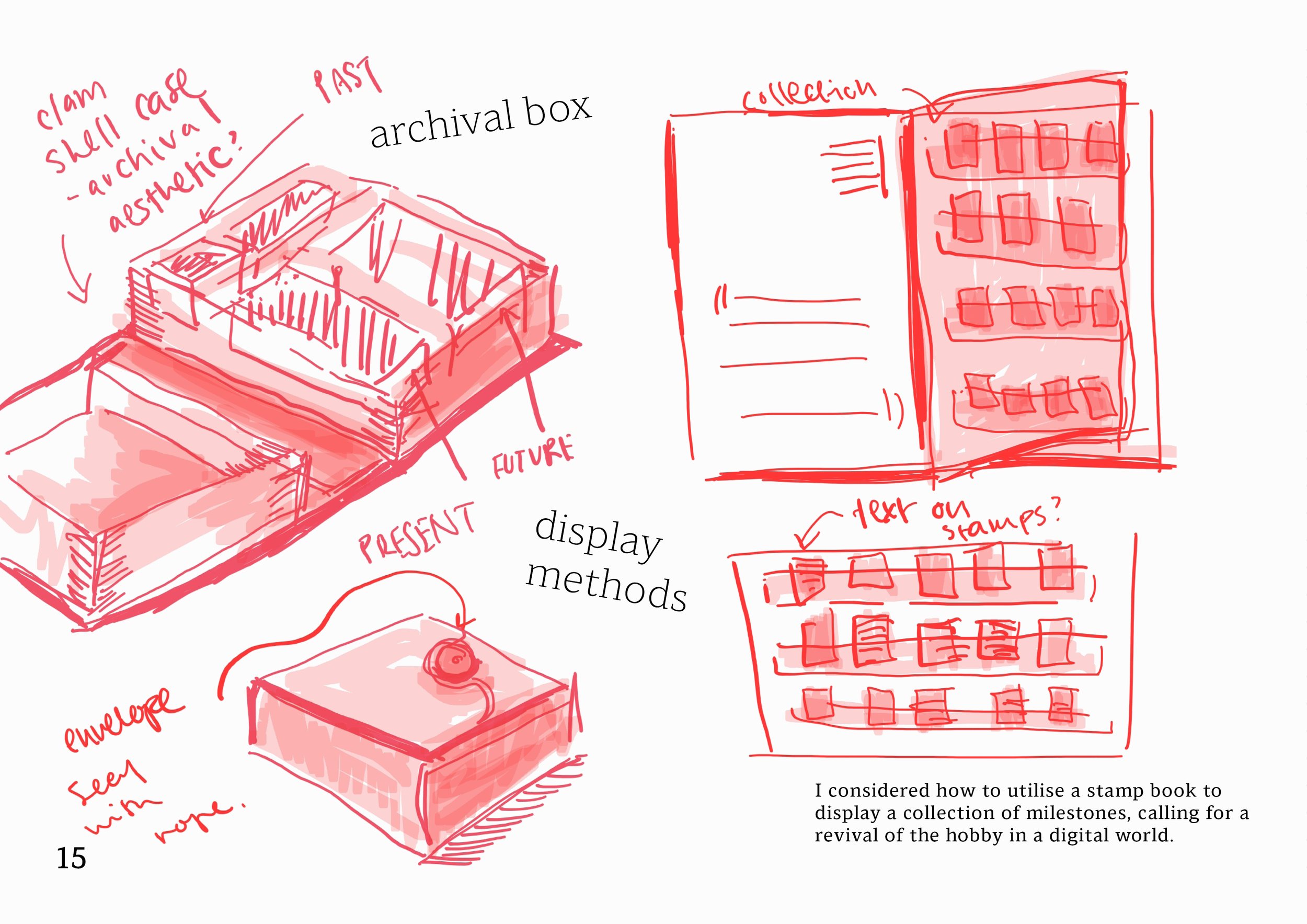 I explored the theme of Milestones through research into inventions and cultural artefacts, eventually returning to a nostalgic interest in postage stamp collecting - this became the foundation of the project. I researched the cultural, historical and economic significance of stamps, including a visit to the Postal Museum, to understand their evolution as communication tools and define the direction for the project.